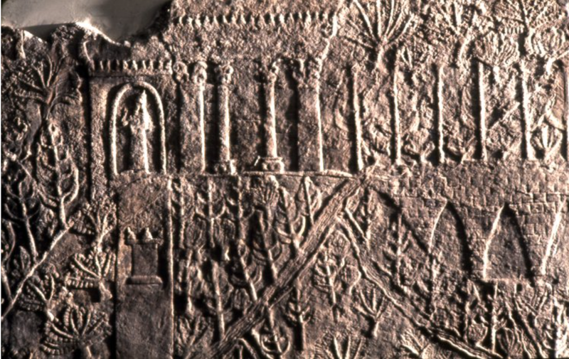 The bas-relief of Sennacherib’s gardens, and line copy for ease of viewing. The relief came from the North Palace of Ashurbanipal (669–631 BC) at Nineveh.
