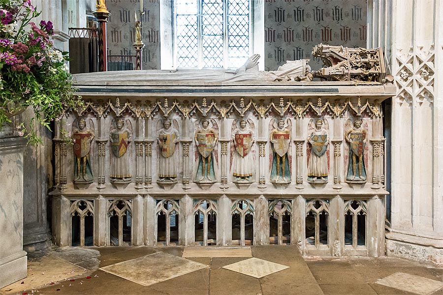 Alice Chaucer died in 1475 in late May or early June, and was buried in the parish church of Ewelme. The effigy erected over her tomb, and commissioned by Alice, is incredibly fine. An example of a medieval cadaver tomb, popular at the time as a reminder of human mortality, it has Alice in life and grandeur on the top, wearing finery and her garter. Underneath, she is shown as a decaying corpse. Made from alabaster, the inscription praises her for her charity, whilst the 16 heraldic shields carved into the tomb promotes her high status.
