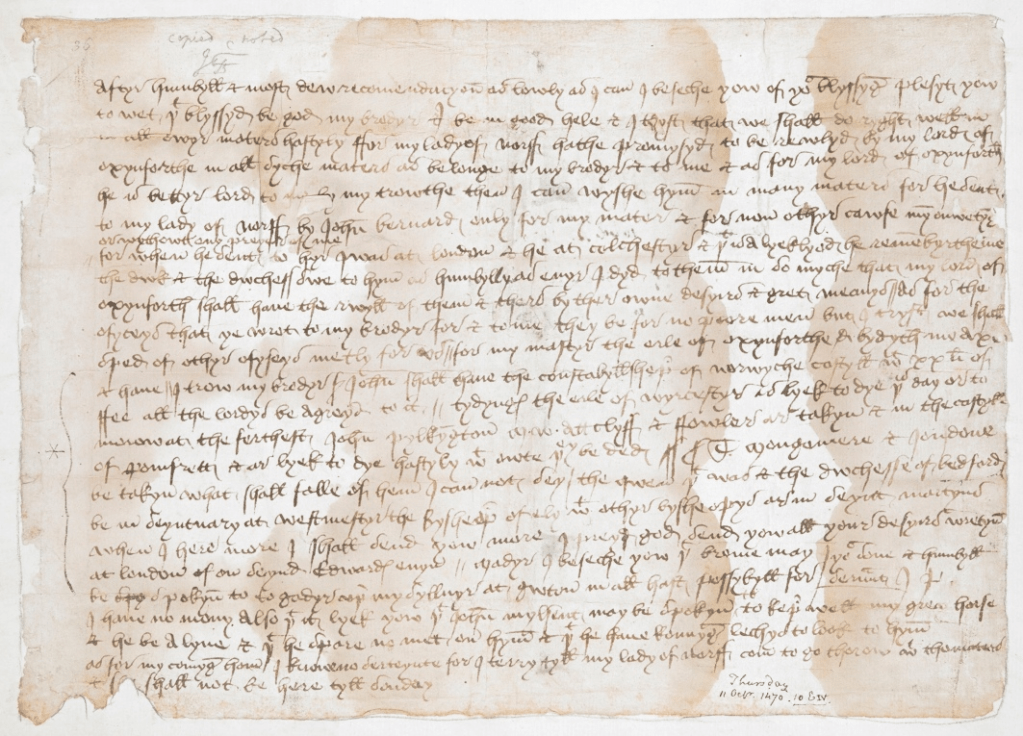By the time of her widowhood, Alice had seen much of the world, and she was a shrewd woman who was not to be taken advantage of without the protection of a man. The Paston family of Norfolk were prolific letter-writers, and their surviving correspondence is an invaluable resource for the fifteenth century. In one of her letters, Margaret Paston warns her son that he should take friends and counsellors with him if he was ever to encounter Alice, for she was crafty and intelligent.