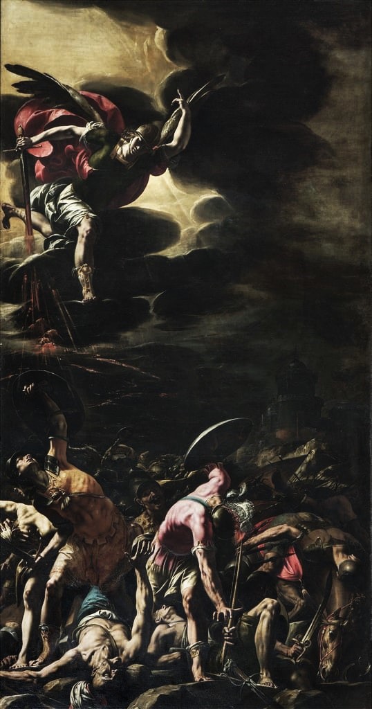 The act of divine intervention by miracles of God was also an important feature of Catholic theology and the Decree instructed that all clergymen must teach their congregation the benefit of praying to saints “offer up their own prayers to God for men.” Paolo Veronese’s Allegory of the Battle of Lepanto (1572) and Tanzio da Varallo’s Battle of Sennacherib (1629-30) are both powerful examples of how artists integrated Catholic practices into their paintings to produce magnificent yet accessible scenes for all. Veronese celebrates the defeat of the Ottoman Turks against the fleets of the Holy League (basically, a fleet of loads of Catholic nations and principalities including Spain, Venice, and the Papal States) and Tanzio depicts the triumph of Hezekiah, the King of Judah, against the Assyrian King Sennacherib. Again, the clever and innovative use of light and dark (also known as tenebrism) accentuates the central role of saints interceding on behalf of God. Veronese depicts the beneficent rays of the Virgin Mary which shine down from Heaven and illuminate the victors’ ships, while darkness torments the Turkish fleet. Tanzio’s angel is illuminated by the presence and protection of God as he plunges into the darkness of bloodshed.