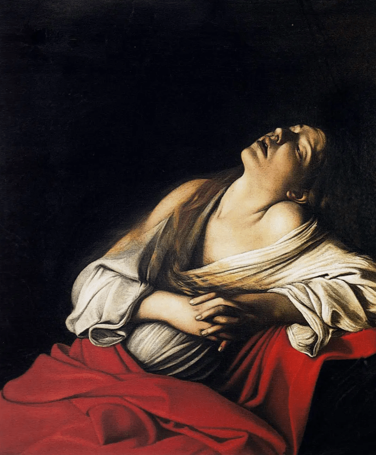 Caravaggio’s Magdalene Klain (post 1606) and Gentileschi’s Mary Magdalene in Ecstasy (circa 1620-25) both show the saint in rapture in her solitude. Ecstasies and raptures were psycho-physical conditions at the peak of mystical activity – their use in sacred art makes the viewer want to experience what’s unfolding before their eyes rather than just look at it ‘from outside’. Both paintings portray Mary Magdalene physically and emotionally overcome in rapture, leaning back with her eyes closed and hands clenched together. In Caravaggio’s depiction, her mouth is open slightly which only adds to the uncontrollable nature of her spiritual awakening from her life of sin to a contemplative moral existence. The use of Mary Magdalene in ecstasy excited an emotional response from worshippers over the intensity and drama of spiritual awakening and religious conversion.