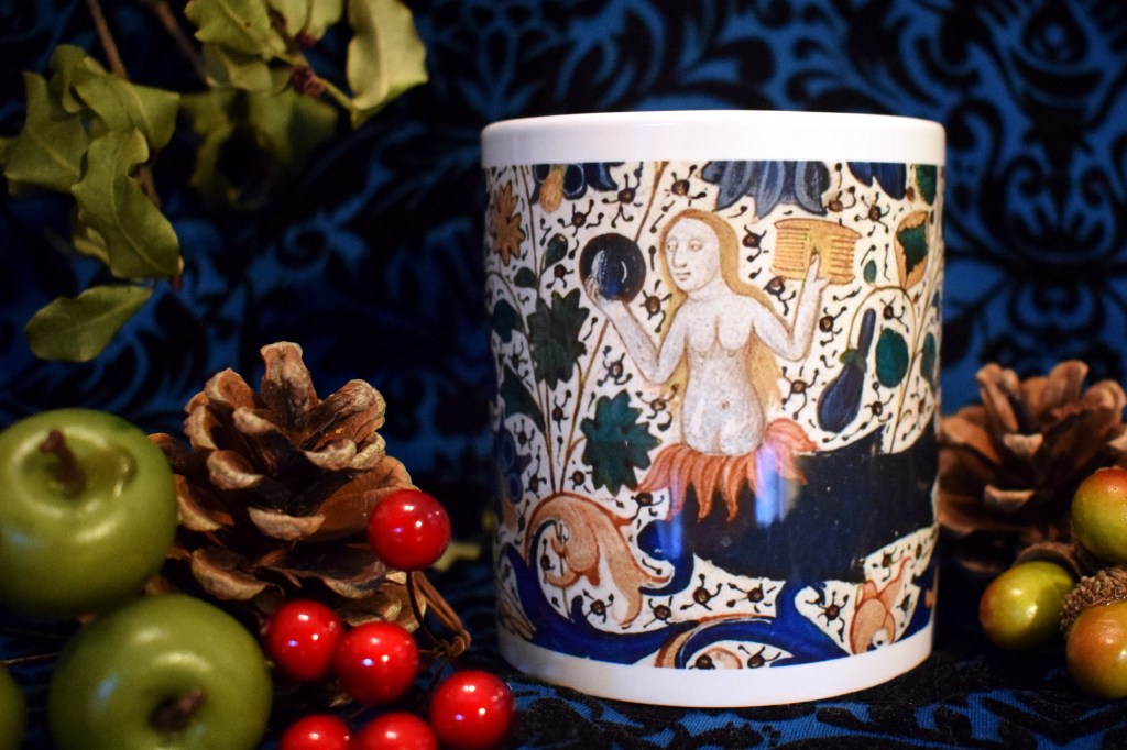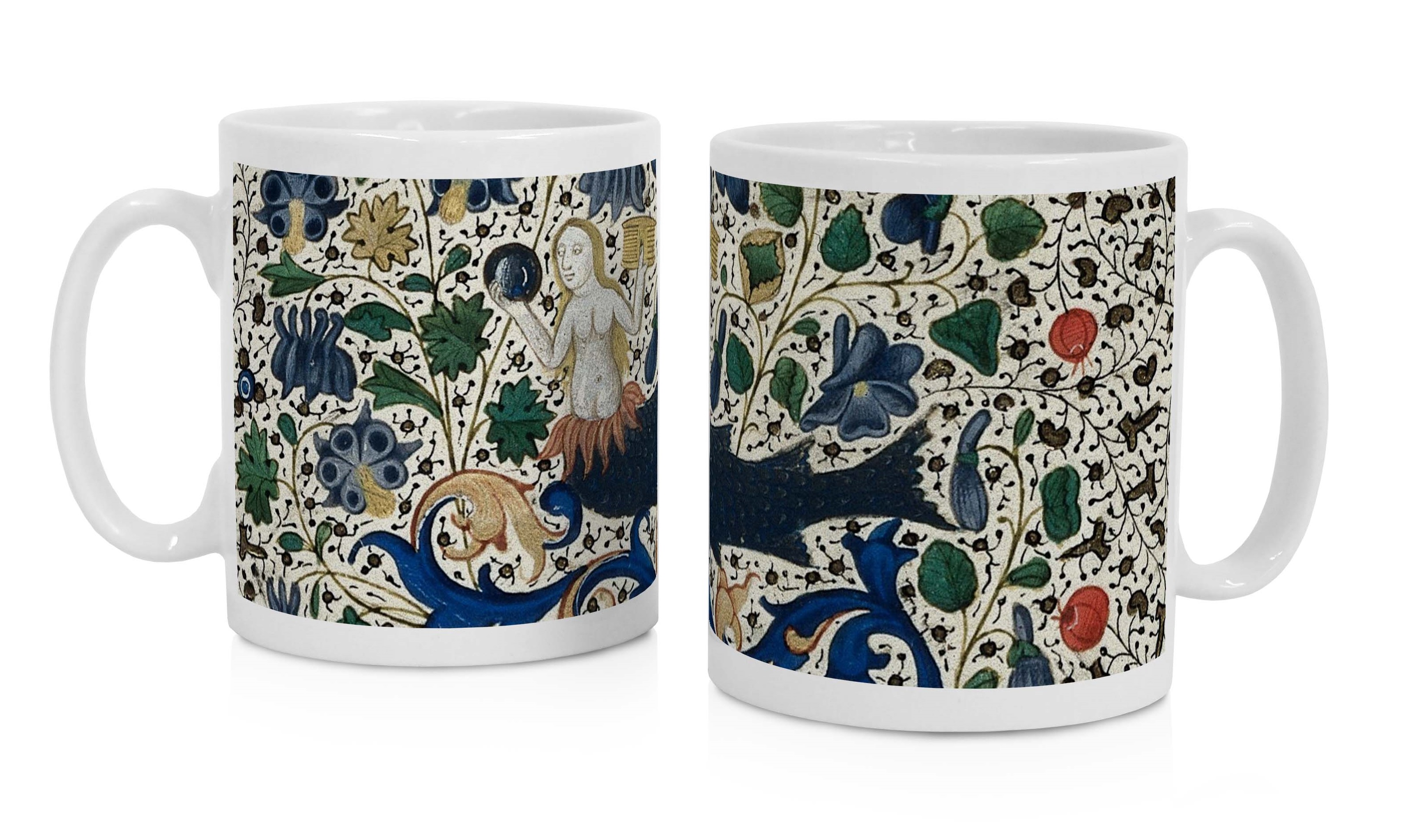 Detail of a miniature of a mermaid with a mirror and comb, c.1460-1487, from British Library Harley 4372 f. 79v. A mug with a mermaid holding a mirror and comb from a fifteenth-century manuscript. Postage included, UK only.